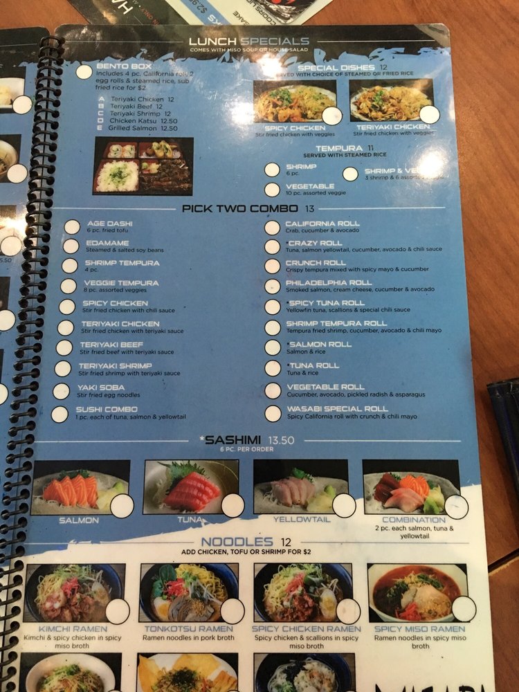 6 sashimi, 6 nigiri of chef's choice, and 1 choice of roll (fill in special instructions please) (no Mt.Fuji & Heart Attack & Broncos Roll).